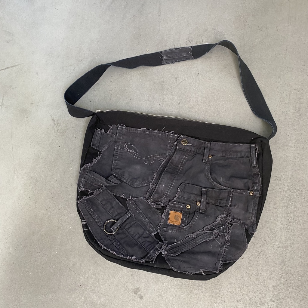 Bolsa desenvolvida através de patchwork com calça Carhartt Og. Base da peça em brim, abertura em zíper + forro com bolsos internos. Diversos detalhes + bolsos em ambos os lados da peça.
