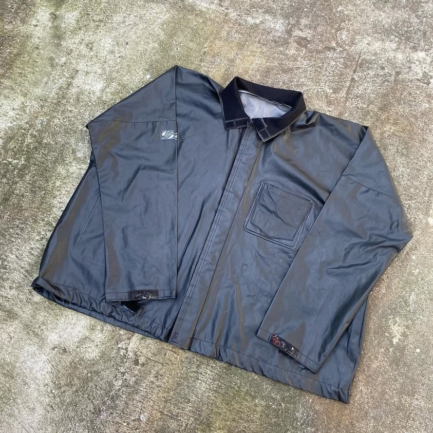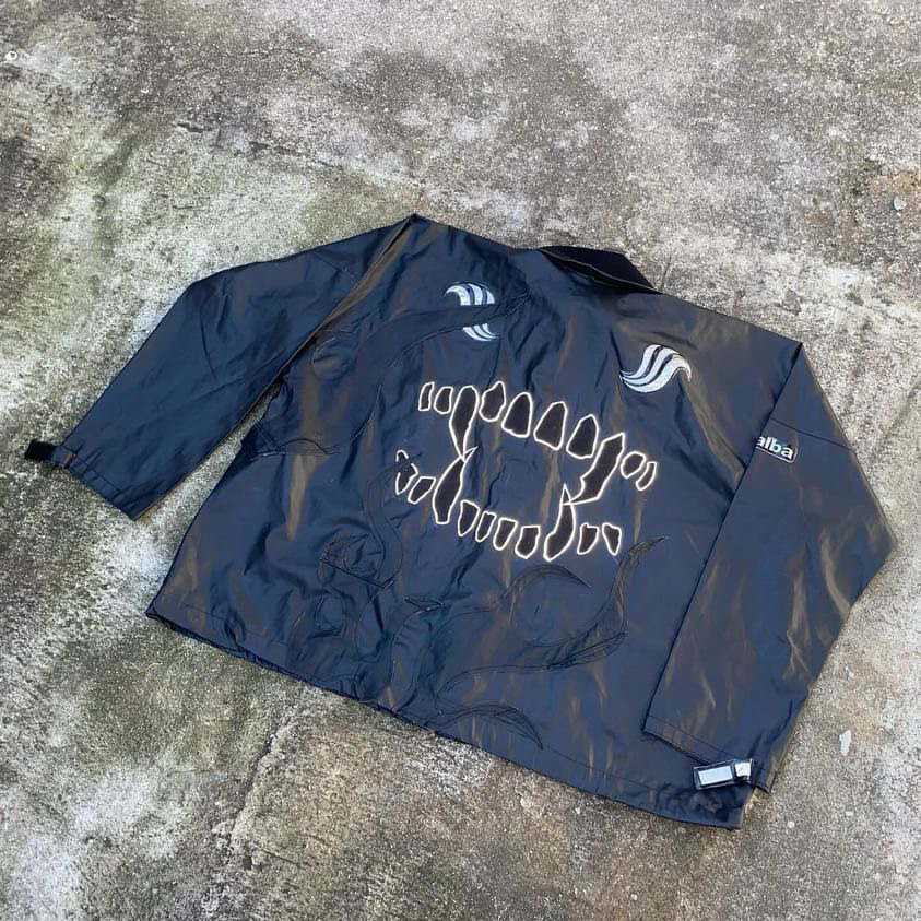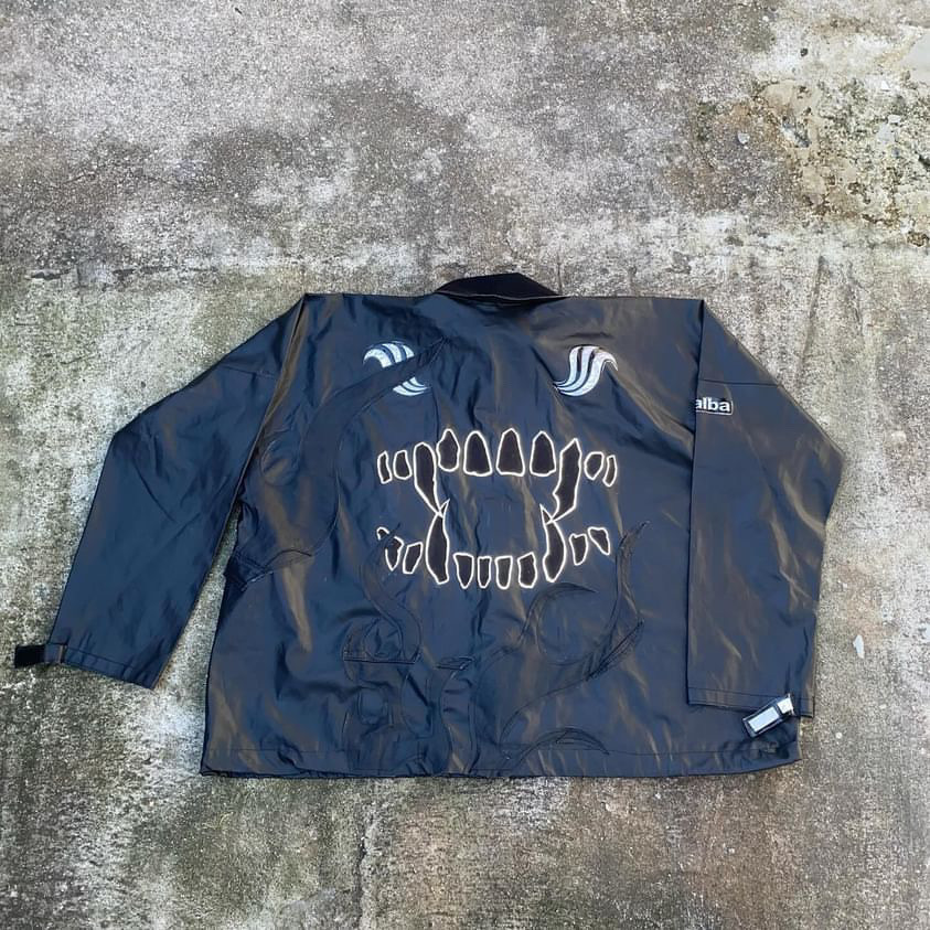 Jaqueta em lona com detalhes de fogo em couro. "Mordida" refletiva nas costas. Peça possui pequenos detalhes de uso.
