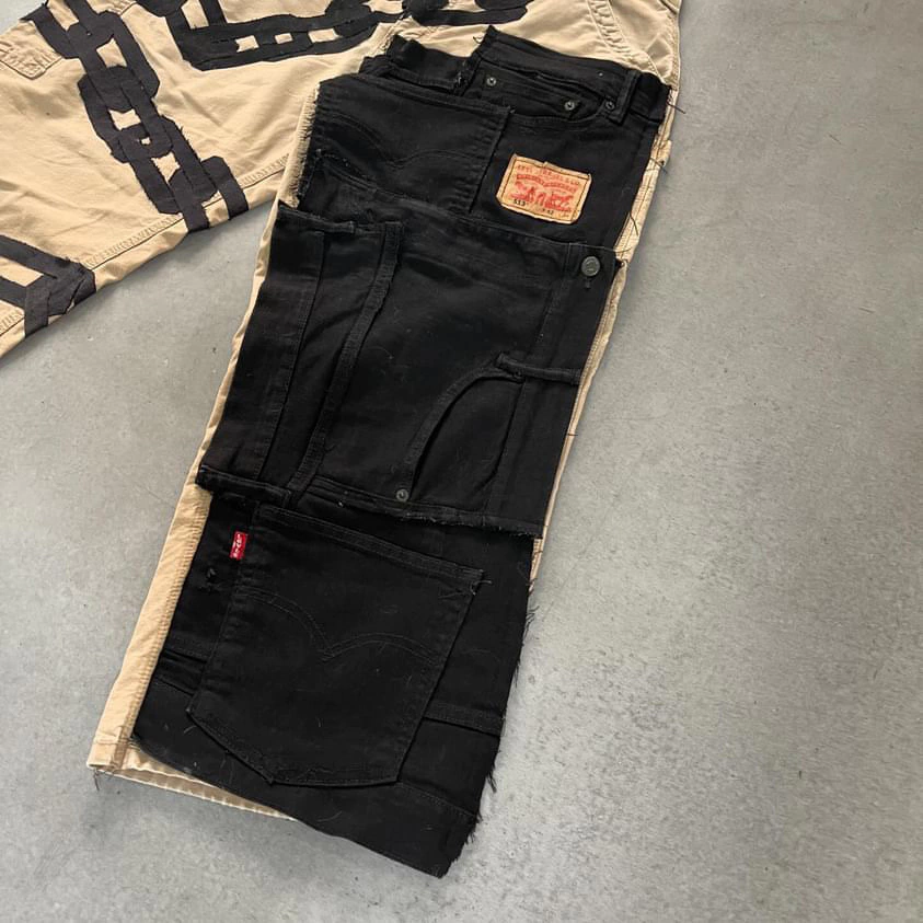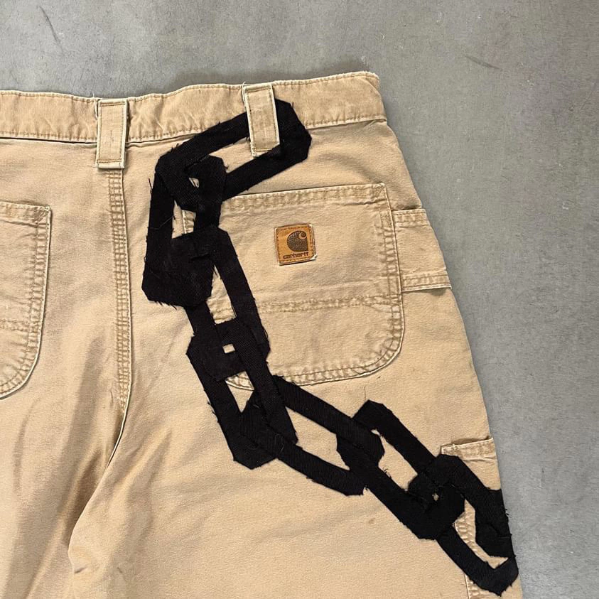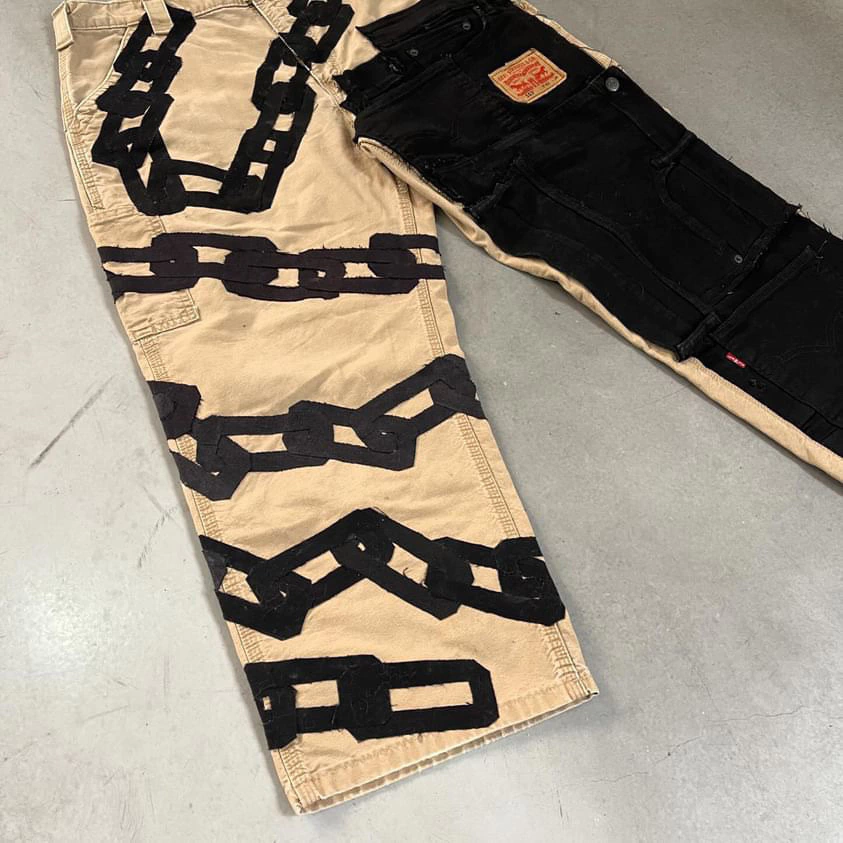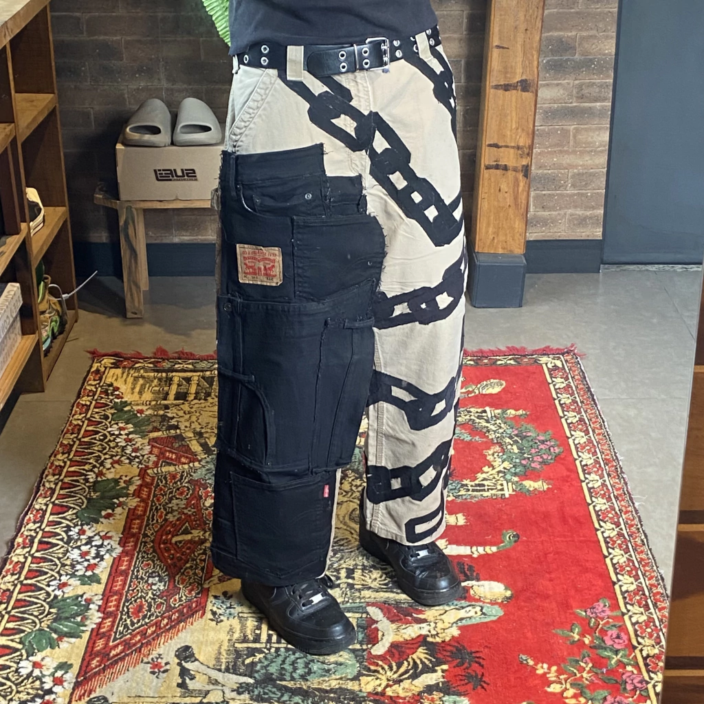 Calça CARHARTT OG - Trabalho em patchwork feito com uma peça Levi's (nova), uma das pernas com diversos detalhes + bolsos. Na outra, correntes feitas também em jeans. Uma das melhores do drop <3