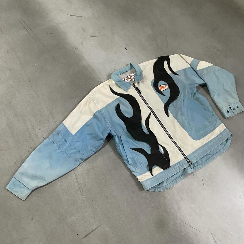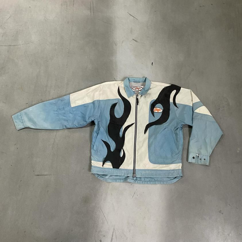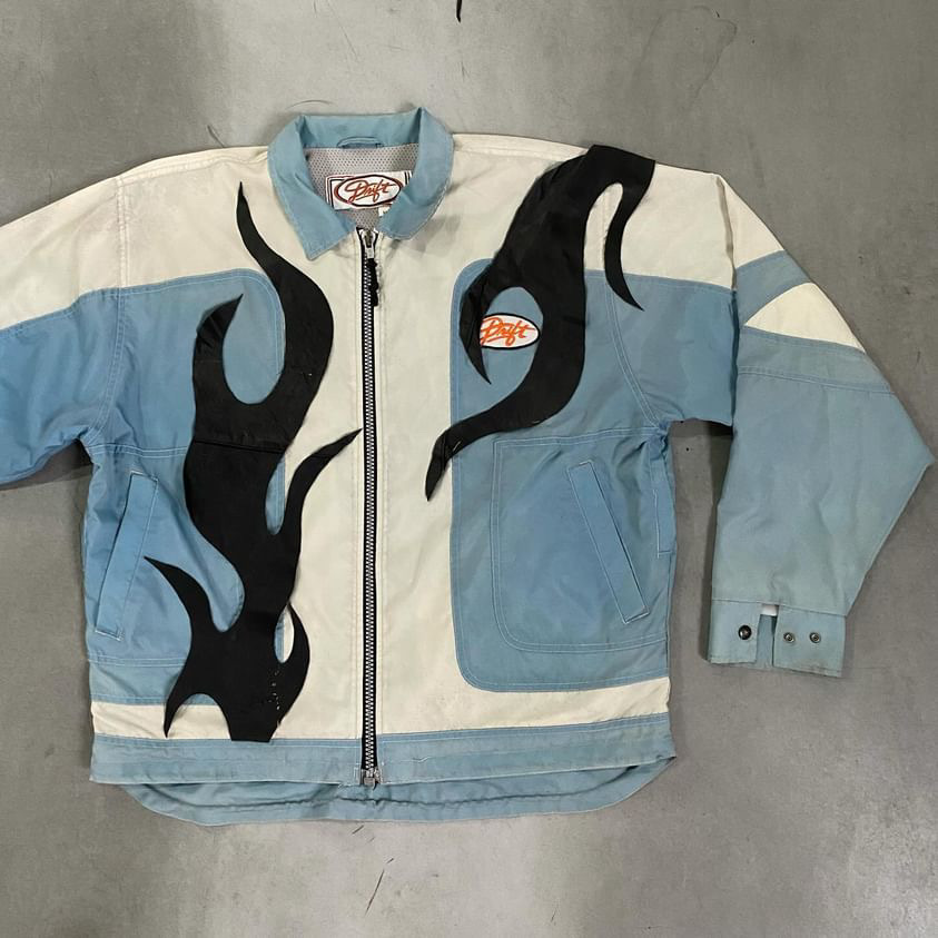 Jaqueta Vintage (Tecido estilo Tactel), peça forrada. Detalhe em fogo feito com couro legítimo. Peça possui detalhes de uso / tempo, porém não influência na sua estética, é uma grande raridade.