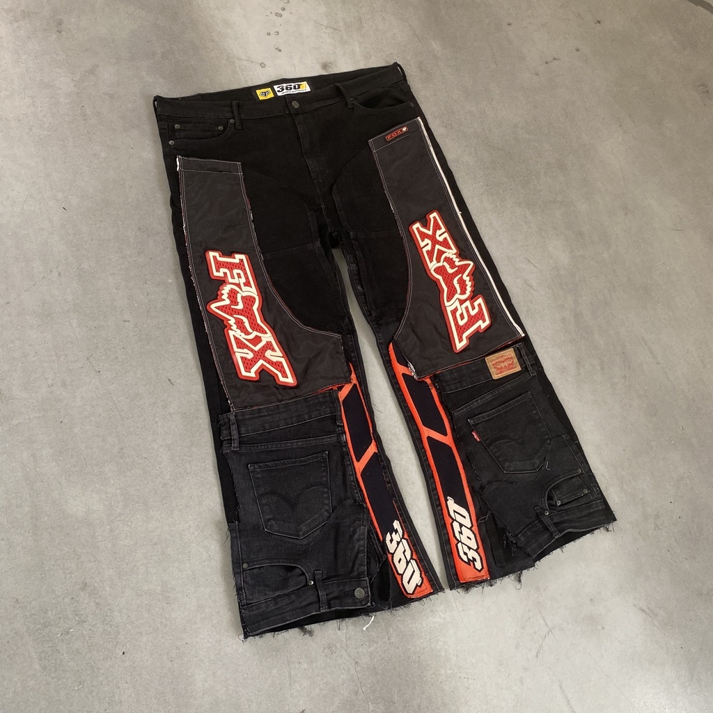 Calça jeans Levis (na tag) com modelagem adaptada. Trabalho em patchwork feito com peça Fox Racing OG, diversos detalhes + bolsos. Absurda a qualidade & detalhes dessa peça. Única no mundo 💫