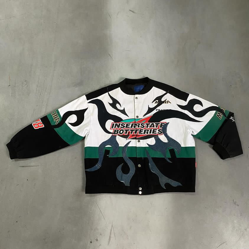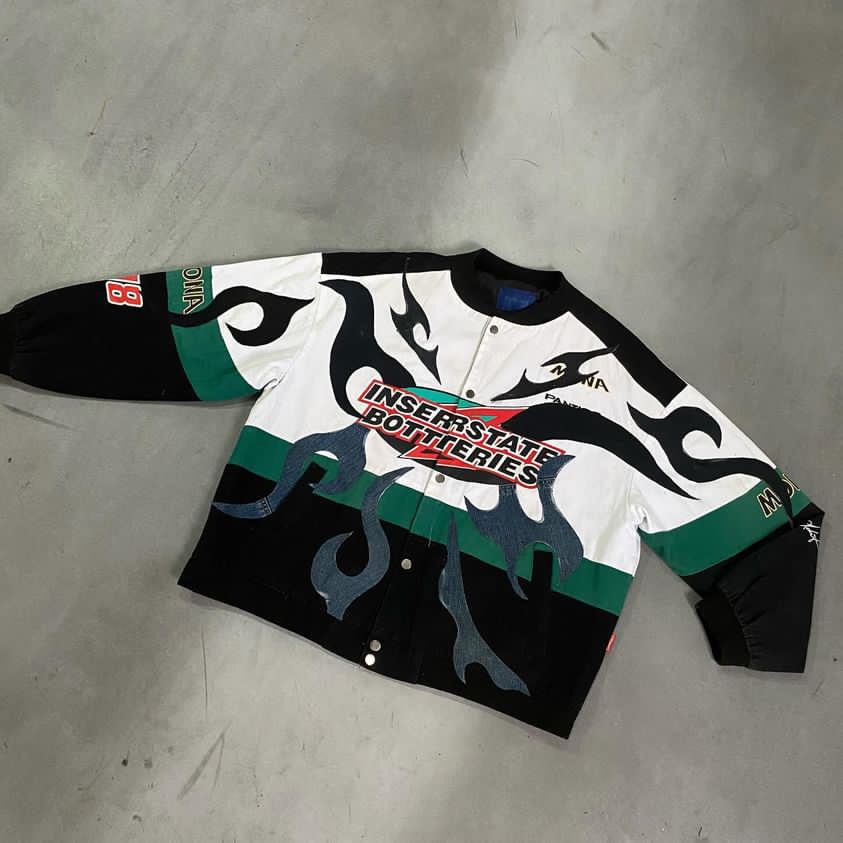 Jaqueta (Sarja) com fechamento em botão, trabalho de patchwork em jeans.