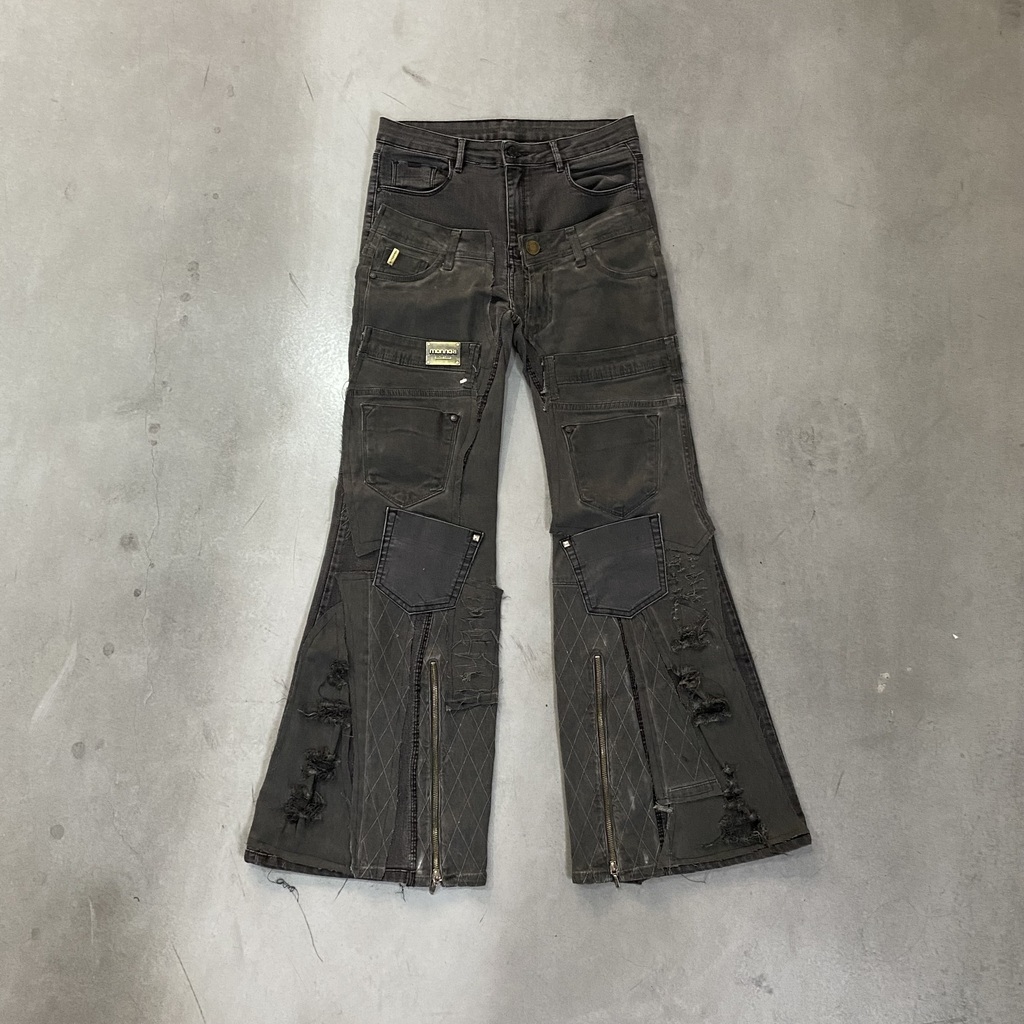 Calça Jeans com trabalho em patchwork, modelagem aumentada (perna alargada), diversos detalhes + bolsos. Ziper lateral.